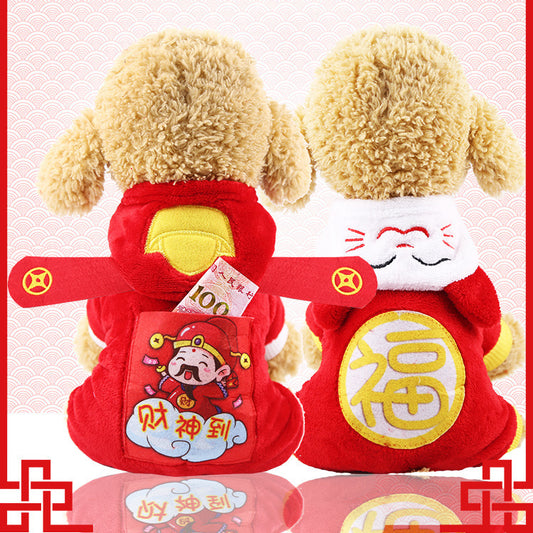 Dog Festive New Year Clothing Flannel cotton-padded coat Dog four-legged coat Cat Pet supplies Autumn and Winter God of Wealth